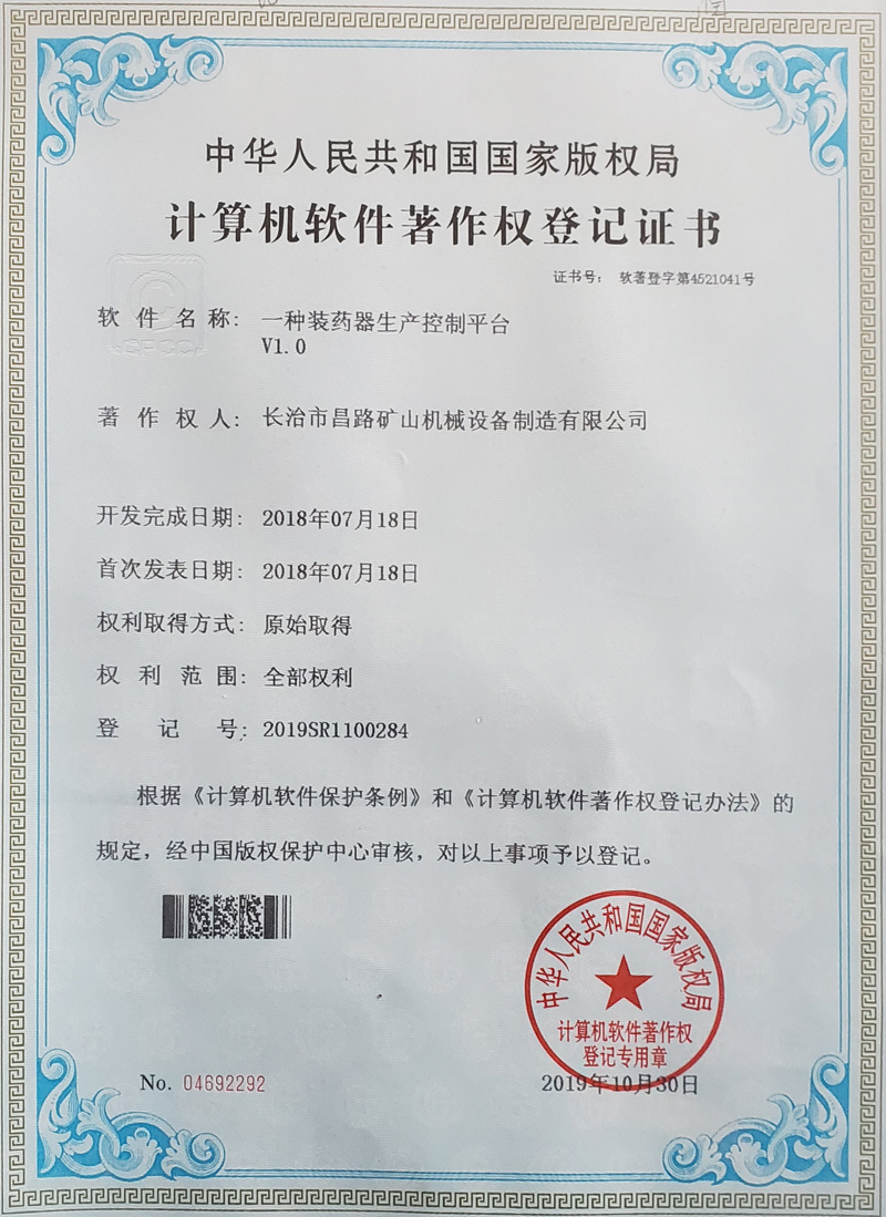 榮獲裝藥器生產控制平臺著作權登記證書