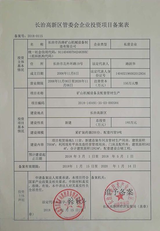 長治高新區(qū)管委會(huì)企業(yè)投資項(xiàng)目備案表